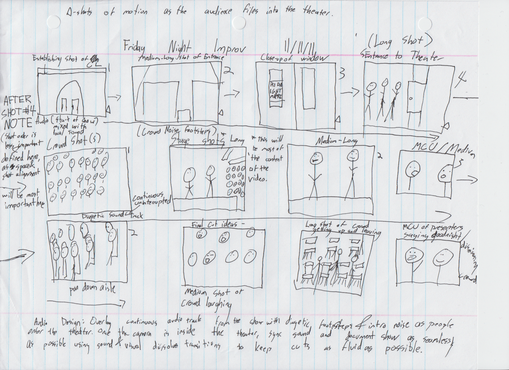 Every Friday, the basement of the University of Pittsburgh houses the Friday Night Improv Show. FNI is a live improvisational comedy show fueled by audience participants as actors. Audience sizes vary, but usually a fairly large crowd shows up. I have not been able to get inside the black box theater in order to shoot inside, or examine the space, though I will either set up a tripod or bring a some kind of steadycam to document the show. I will arrive very early to the show to shoot people first entering the Cathedral and descending the stairs to the theater. After I've gotten a few establishing shots of the cathedral, I will either sit with a tripod and film a stream of people entering the auditorium, or follow a small group freely. (Many of these shots will vary depending on the number of people that show up and the shots that will be available given the confined space). Once the show starts, I will do my best to capture the action taking place on the stage itself with several long shots that either track or follow freely.(I will also make sure to increase my ISO setting on the camera and white balance as best I can in the theater setting). I will take a few shots of the crowd as well, though I believe audio will work well here to establish the crowd presence. Depending on how the show ends and how everyone ends up leaving, I will document either from the stage people filing out of the auditorium or as before, follow a small group. As the show is fairly long, I will try and get one each of the sketches in their entirety and take crowd shots during in-between moments.