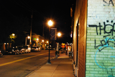 This is a distinctly transitive public space. The chill of October keeps people indoors, and they move quickly between watering holes. Headlights pause, and then speed away. The wind gently tosses loose banners and papers. From the rooftop, it's a scene of cold windswept loneliness with the occassional car passing or conversation leaking out from a bar interrupting