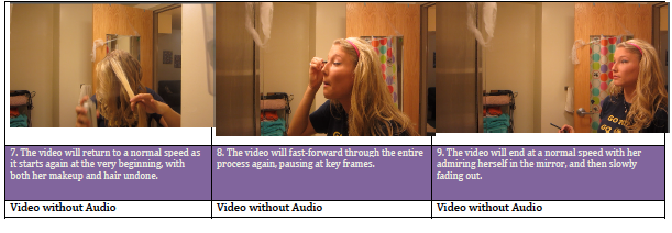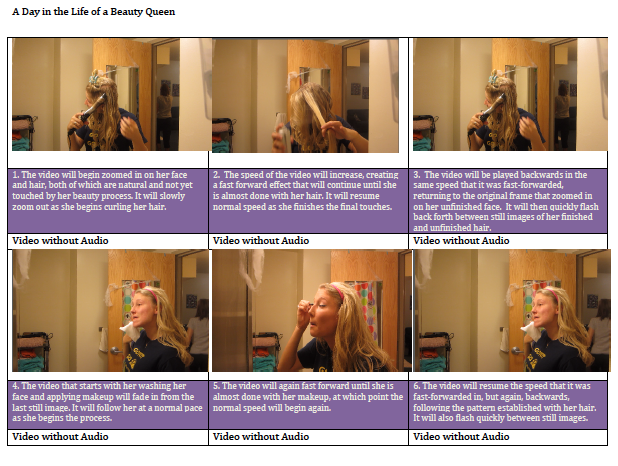 In order to make the video strange, as in accordance with the theme of our class, I plan to first film her normally and sequentially, but then alter the effects of time. I want to show each process in its entirety, and then reverse the film, returning her to her original look. I want the entire video to alternate between raw, in-progress, and finished products, completely disregarding the constraints of time.